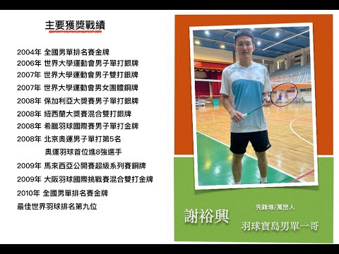 天時:2021年10月17日 地利:高雄中學 人和:謝裕興先生 2006世界大學運動會銀牌、2007夏季世界大學運動會男女團體銅牌和雙打銀牌、2008奧林匹克運動會(北京奧運)8強(為臺灣為首位晉級奧運羽球男子單打8強的選手)。
